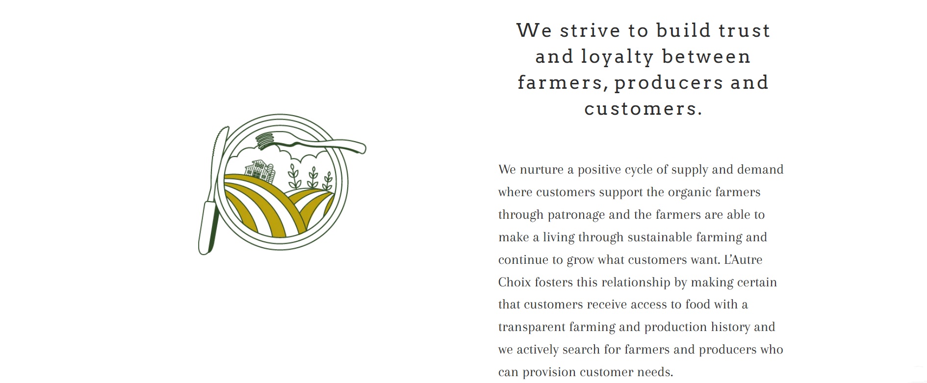 At L’Autre Choix eating “is an agricultural act.” This means that customers can trust that the food they buy comes with a clean bill of health in terms of farming and production history. Organically grown, sustainably farmed, fairly traded, locally produced – these are the values that L’Autre Choix offers to its customers. Not only this, but we also care for our customers by knowing their names, the names of husbands, wives, kids, as well as their health conditions and needs. Our store is stocked with careful attention to food allergies, diabetes, gluten-sensitivity and post-cancer health requirements.