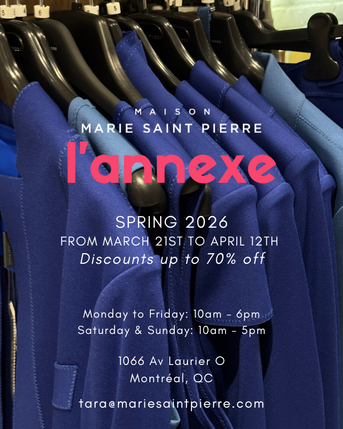 This is the most anticipated moment of the season. The Maison Marie Saint Pierre Spring 2026 Private Sale returns from March 21 to April 12 at our L’Annexe boutique — 1066 Laurier Avenue West, Montreal. Enjoy exclusive discounts of up to 70% on a selection of iconic pieces, samples, and atelier creations, available in limited quantities. Each season, this event attracts lovers of design, art, and contemporary fashion — a must-attend moment to experience the essence of the Maison: creativity, elegance, and local craftsmanship. March 21 – April 12, 2026
